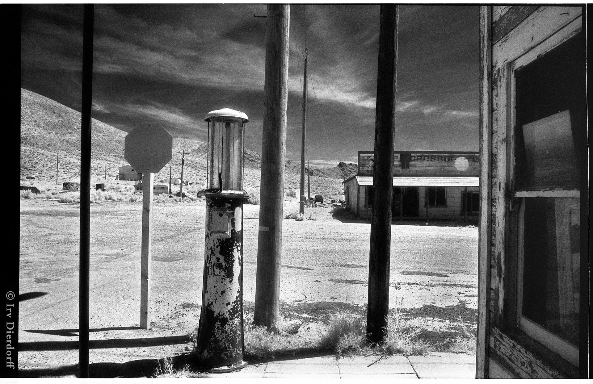 Market and Main Streets, Darwin, California, 1985, scanned 35mm infrared HIE negative.