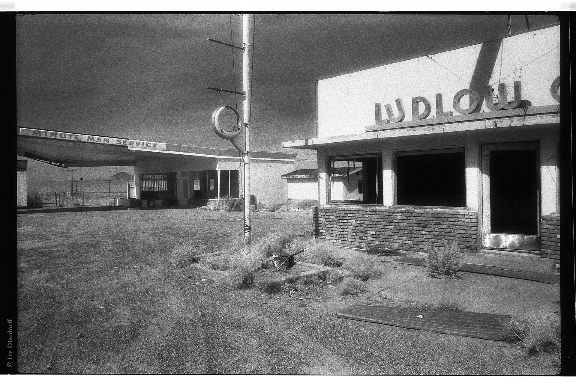 Minute Man Service, Ludlow, California, 1985, scanned 35mm infrared HIE negative.